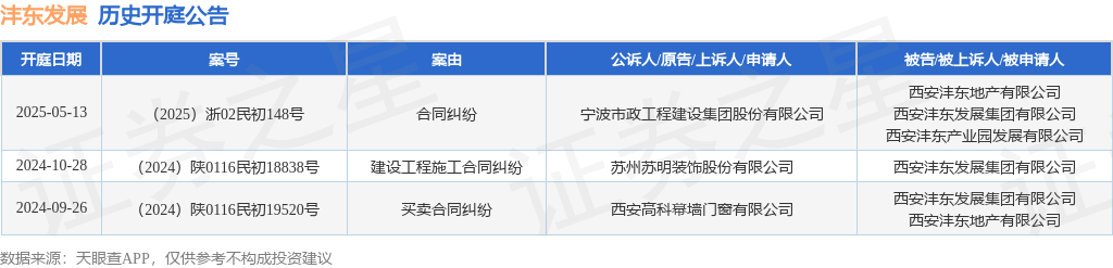 案号:(2025)浙02民初148号审理法院:宁波市中级人民法院案由:合同纠纷当事人信息: 原告/上诉人:宁波市政工程建设集团股份有限公司 被告/被上诉人:西安沣东地产有限公司、西安沣东发展集团有限公司、西安沣东产业园发展有限公司开庭日期:2025年5月13日根据统计,近一年内以西安沣东发展集团有限公司为当事人的历史开庭公告有3则,其中案由为“买卖合同纠纷”的公告以1则居首,其次为“合同纠纷”有1则,“建设工程施工合同纠纷”有1则。历史开庭公告如下: